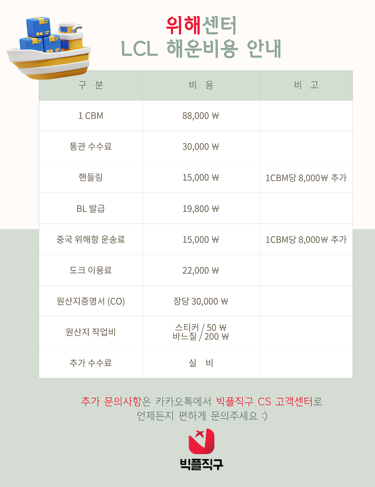 ** 위 비용은 중국에서부터 인천항까지 통관하는 비용이며 국내착지까지 운송료는 착불로 진행됩니다!