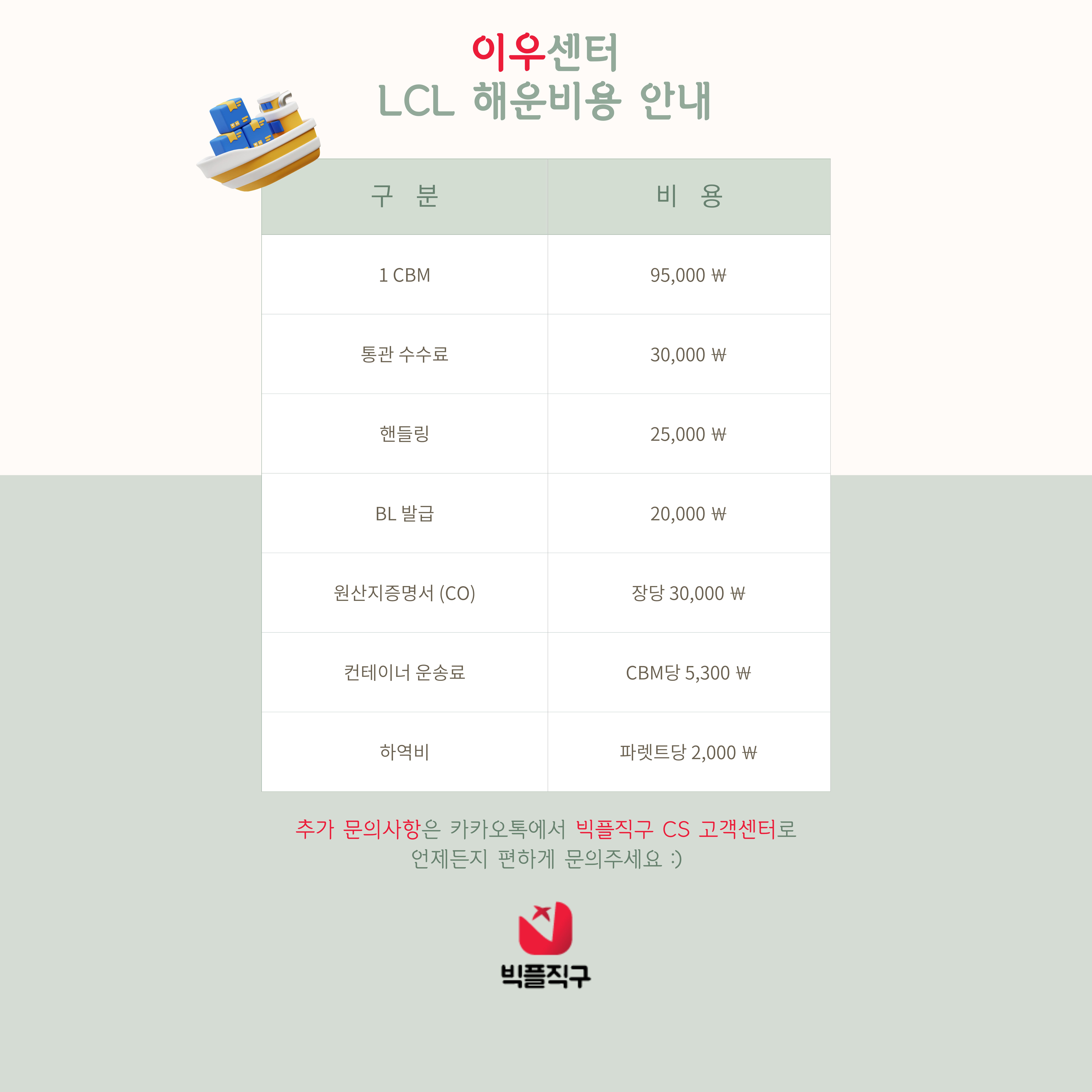 ** 위 비용은 중국에서부터 인천항까지 통관하는 비용이며 국내착지까지 운송료는 착불로 진행됩니다!